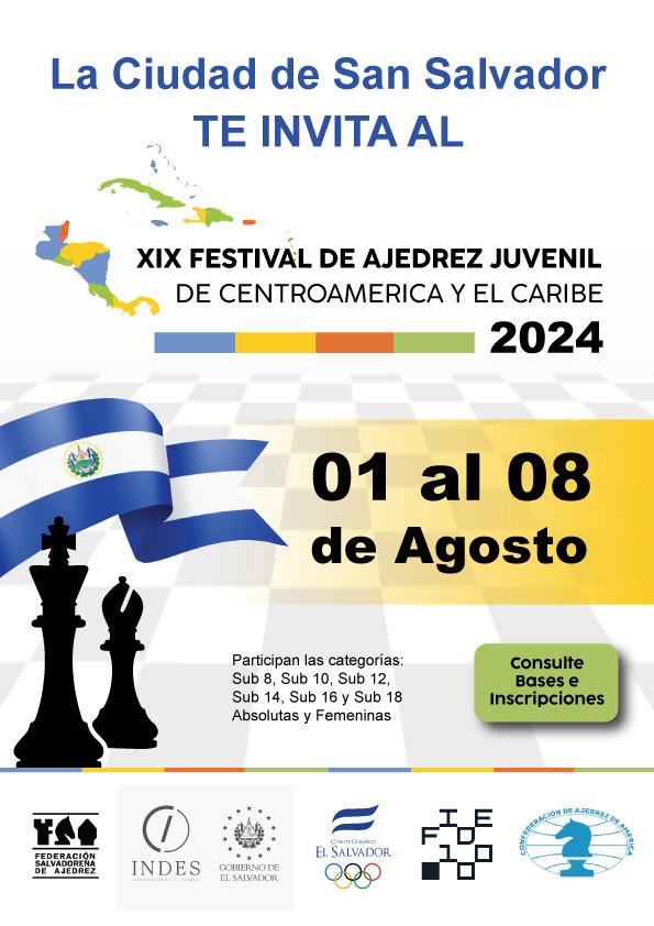 La Federación Salvadoreña de Ajedrez (FSA) y la Confederación de Ajedrez de las Américas (CCA), se complacen en invitar a todas las Federaciones de Centroamérica y el Caribe al “XIX Festival de Ajedrez Centroamericano y del Caribe de la Juventud 2024”, el cual se llevará a cabo en la Ciudad de San Salvador, El Salvador entre el 01 y 08 de agosto de 2024