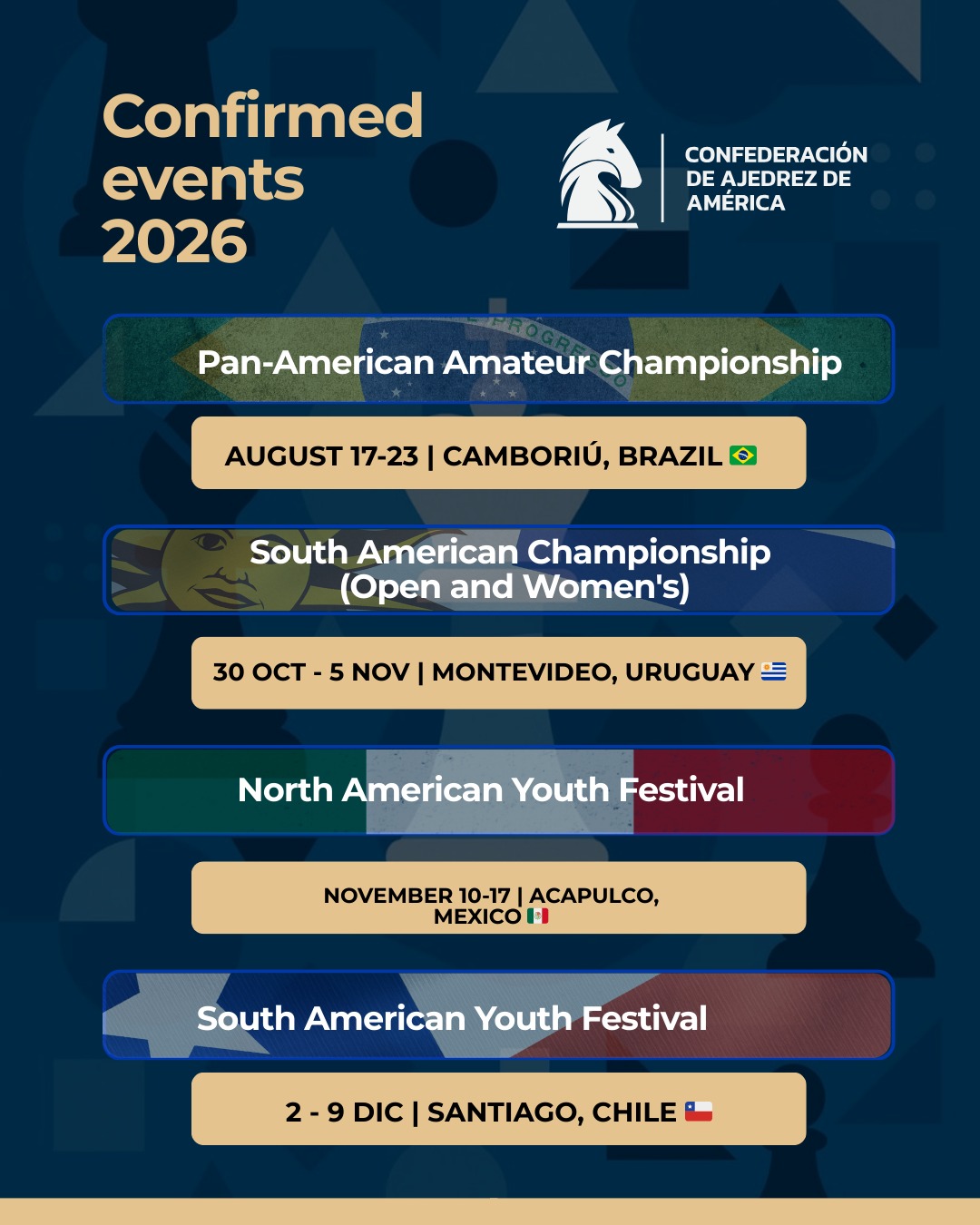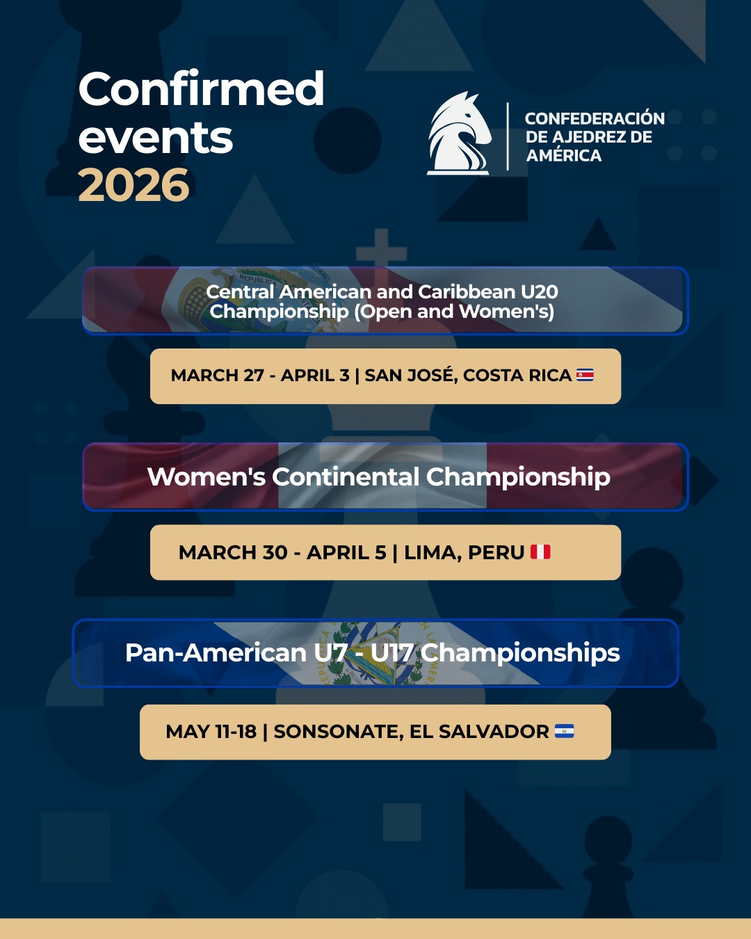 The Chess Confederation of the Americas continues working on coordinating more tournaments for the official 2026 calendar. Dates and venues will be announced as soon as they are confirmed.